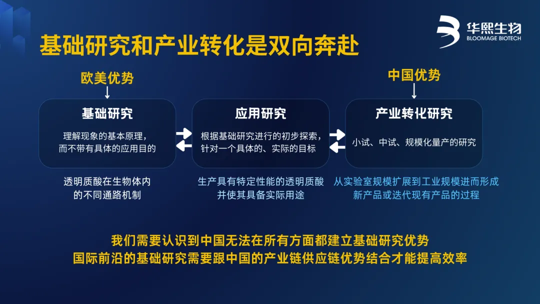 在大多数情况下,企业是很难单独开展研究的,但如果生态头部企业缺乏基础研究布局则很难持续打开局面,如果华为近年来没有投资基础研究,没有结合土耳其数学家的成果,就做不到在5G技术上迅速崛起。华熙也面临类似的挑战。基础研究不是单一企业所能全部支撑的,但我们会有一些探索性的布局,用医美、化妆品等终端应用的资金回补到基础研究。